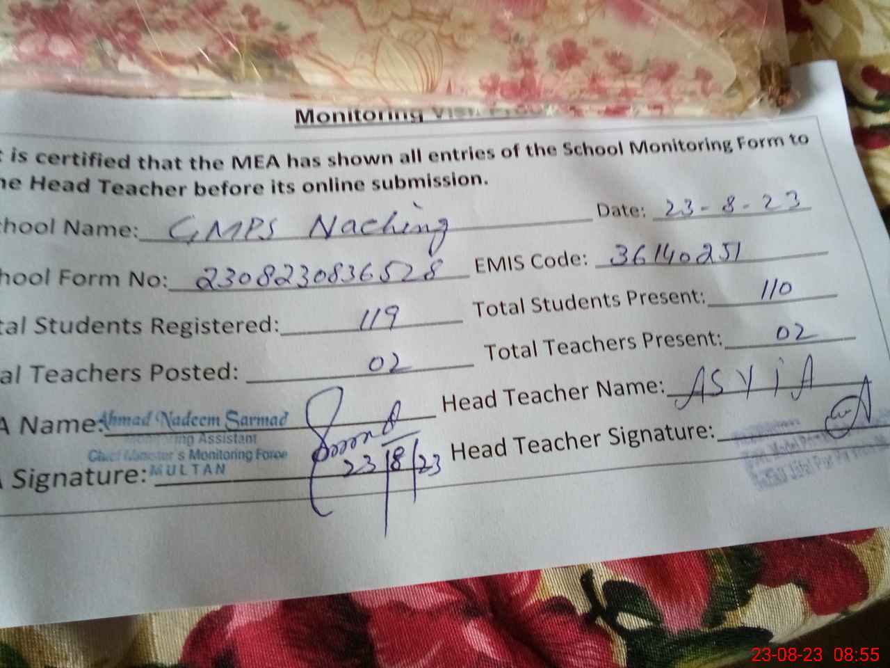 | Attendance Register | Head Teacher | MEA with School | Visit Proof |