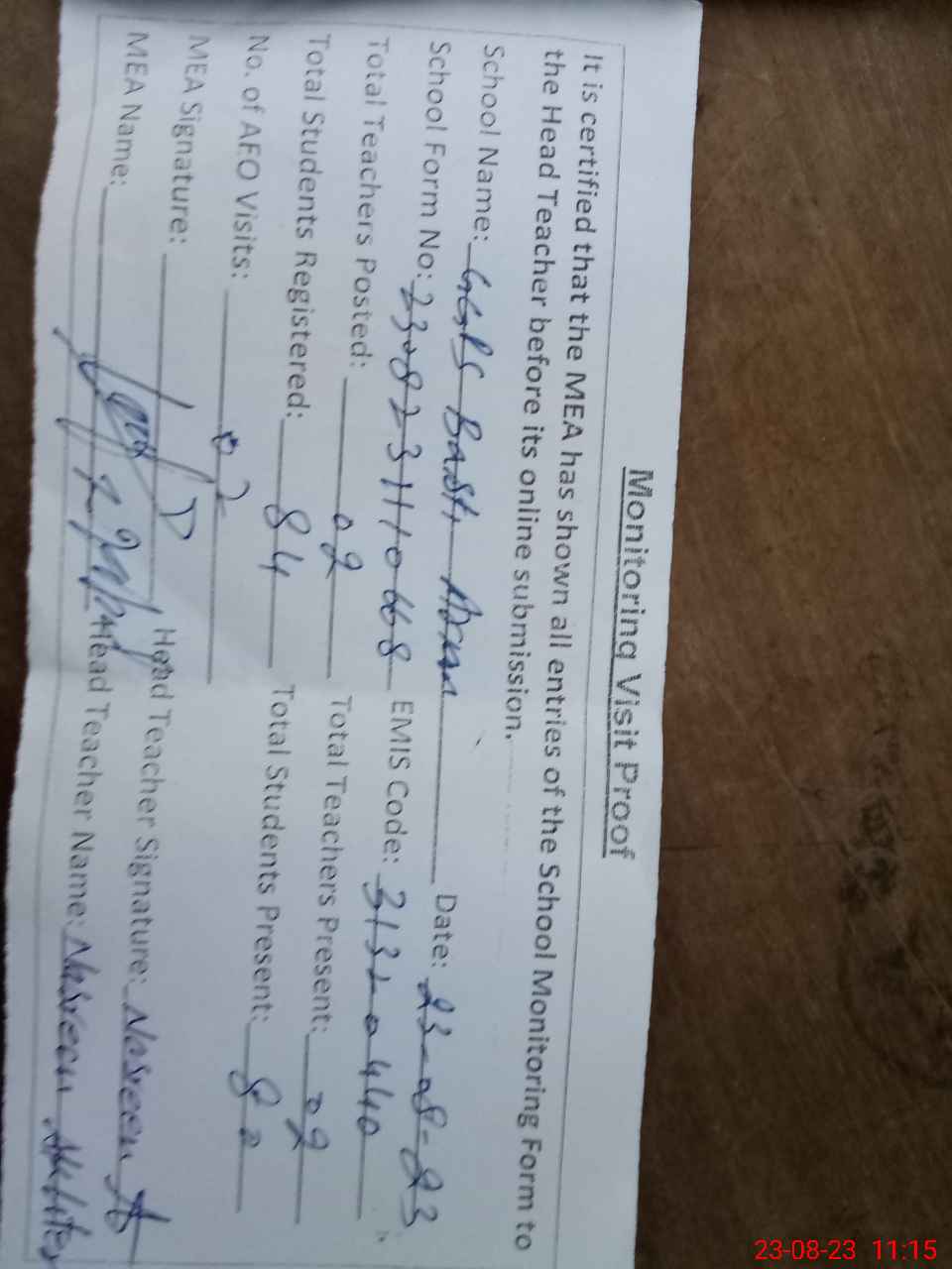 | Attendance Register | Head Teacher | MEA with School | Visit Proof |