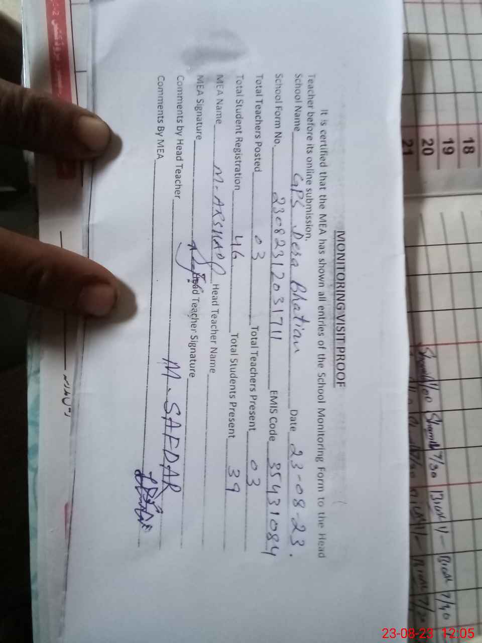 | Attendance Register | Head Teacher | MEA with School | Visit Proof |