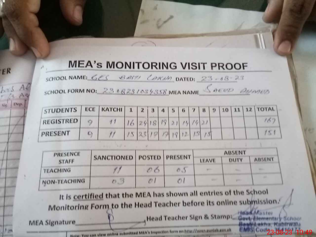 | Certified that this School was Inspected by the Undersigned MEA/DMO Today and the Information Stated Above is as Per Record. | |||||
