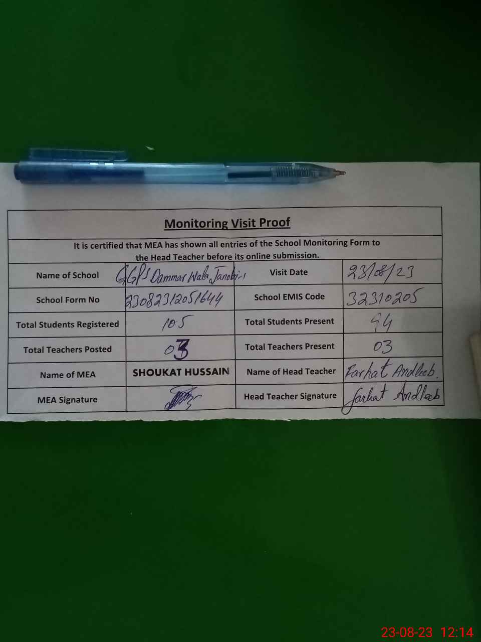 | Attendance Register | Head Teacher | MEA with School | Visit Proof |