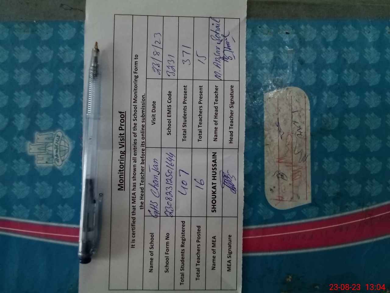 | Attendance Register | Head Teacher | MEA with School | Visit Proof |