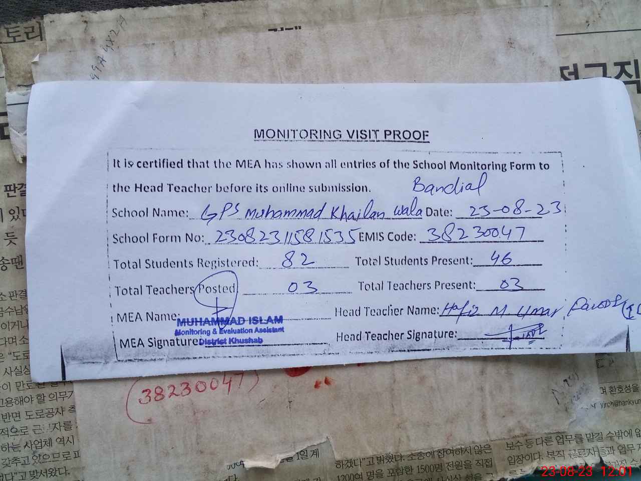 | EMIS Code: 38230047 | Name of School: GPS MUHAMMAD KHAILAN WALA BANDIAL | |||