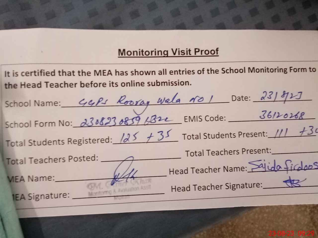 | Attendance Register | Head Teacher | MEA with School | Visit Proof |