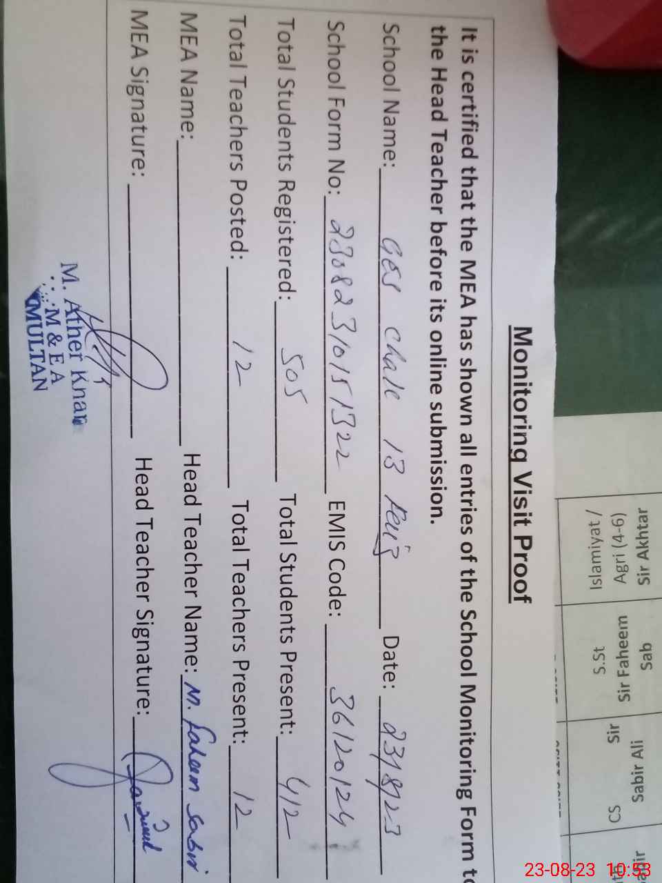 | Attendance Register | Head Teacher | MEA with School | Visit Proof |