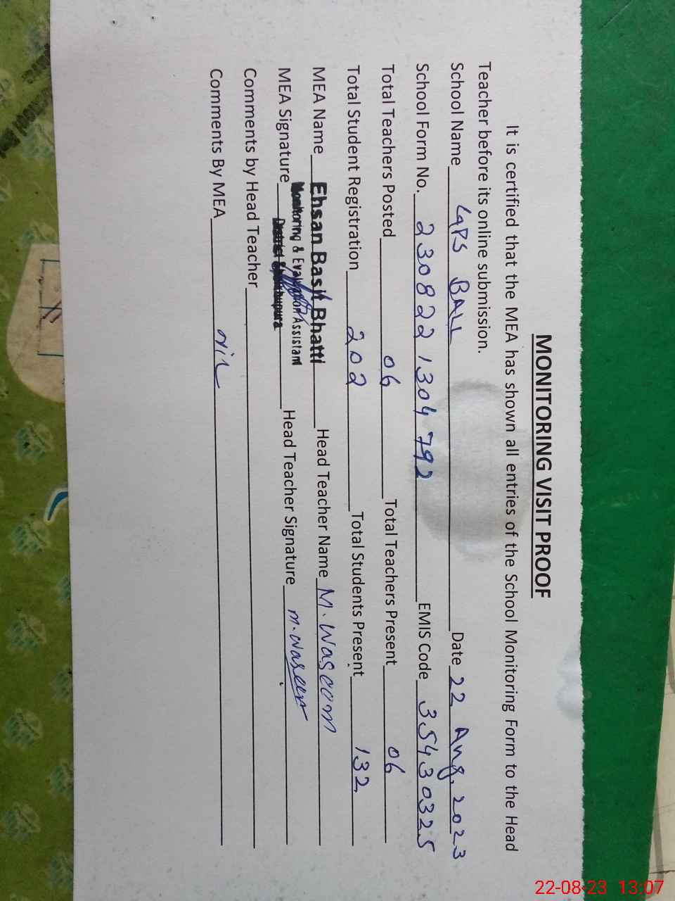 | Attendance Register | Head Teacher | MEA with School | Visit Proof |