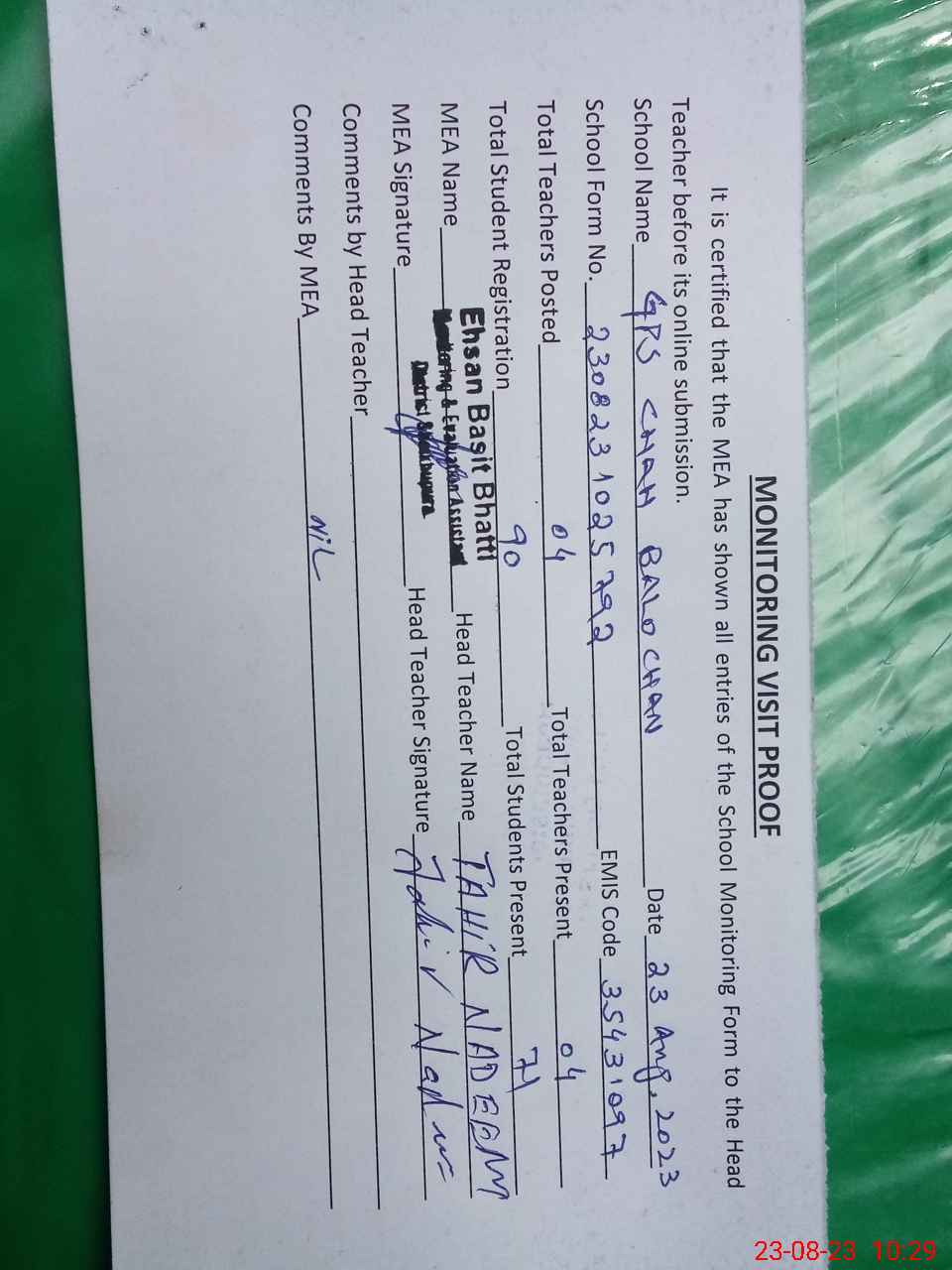 | EMIS Code: 35431097 | Name of School: GPS CHAH BALOCHAN | |||