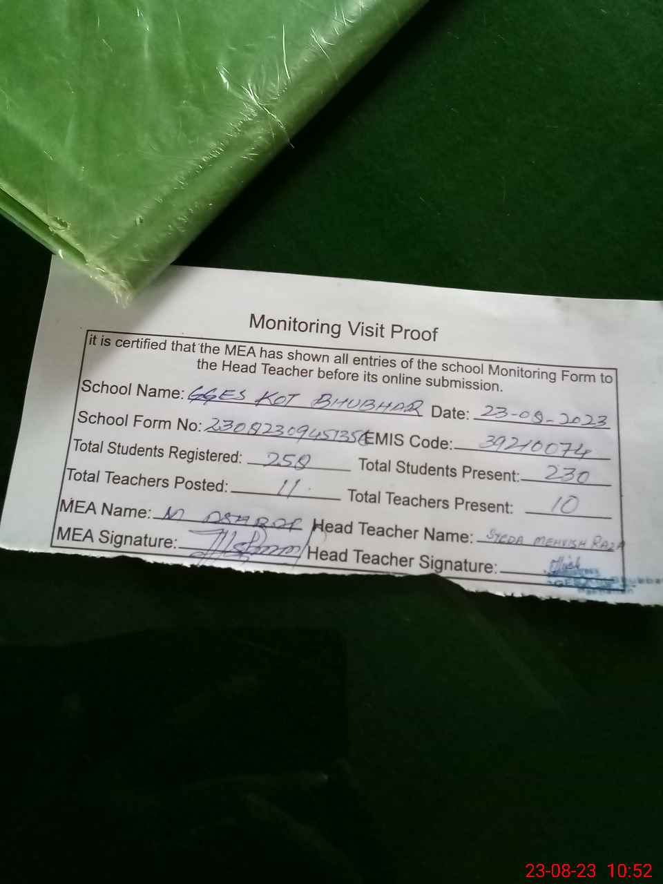 | Attendance Register | Head Teacher | MEA with School | Visit Proof |