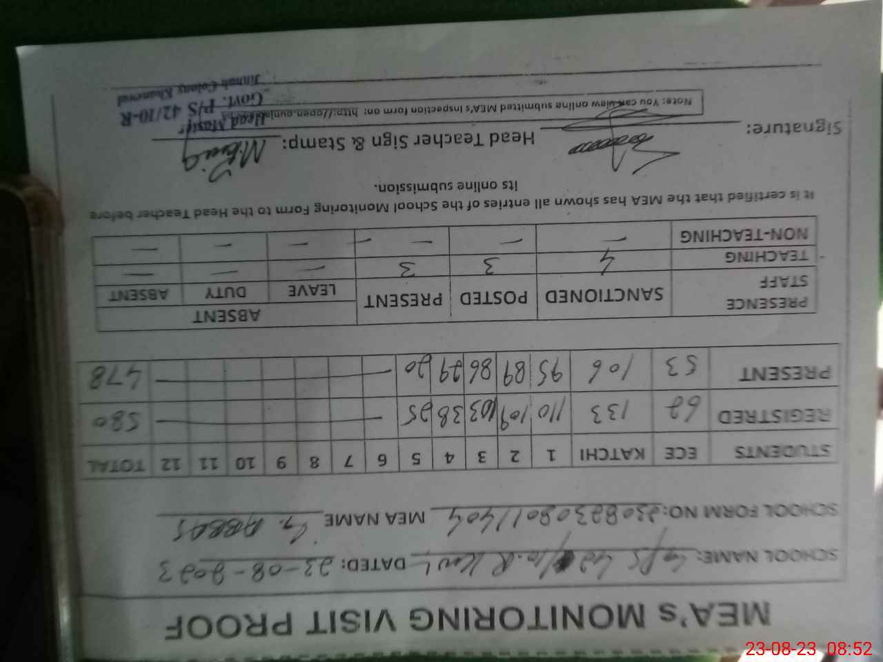 | Attendance Register | Head Teacher | MEA with School | Visit Proof |