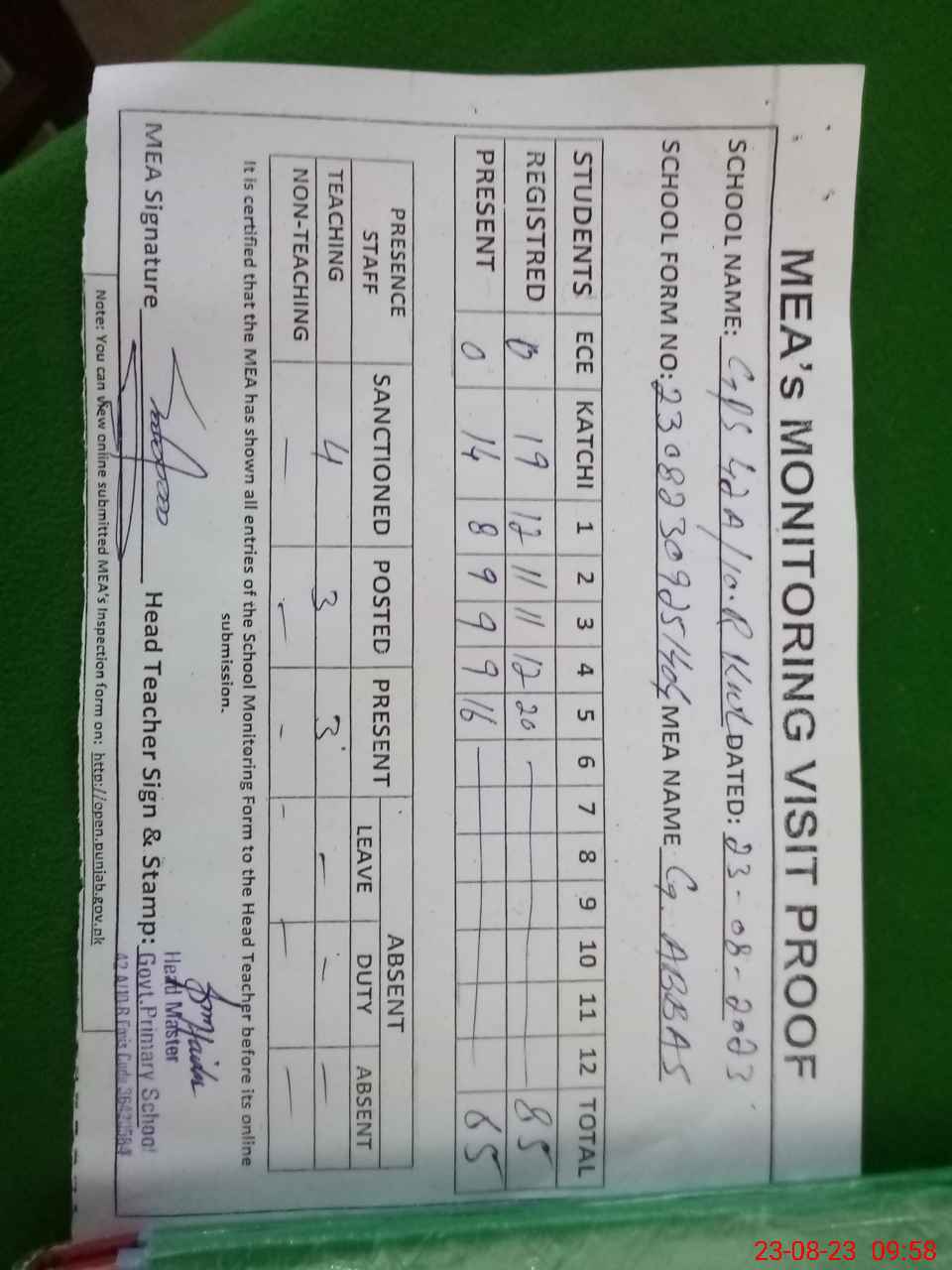 | Attendance Register | Head Teacher | MEA with School | Visit Proof |