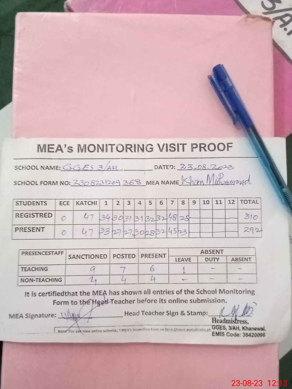 | EMIS Code: 36420096 | Name of School: GGES 3/AH, KHANEWAL | |||