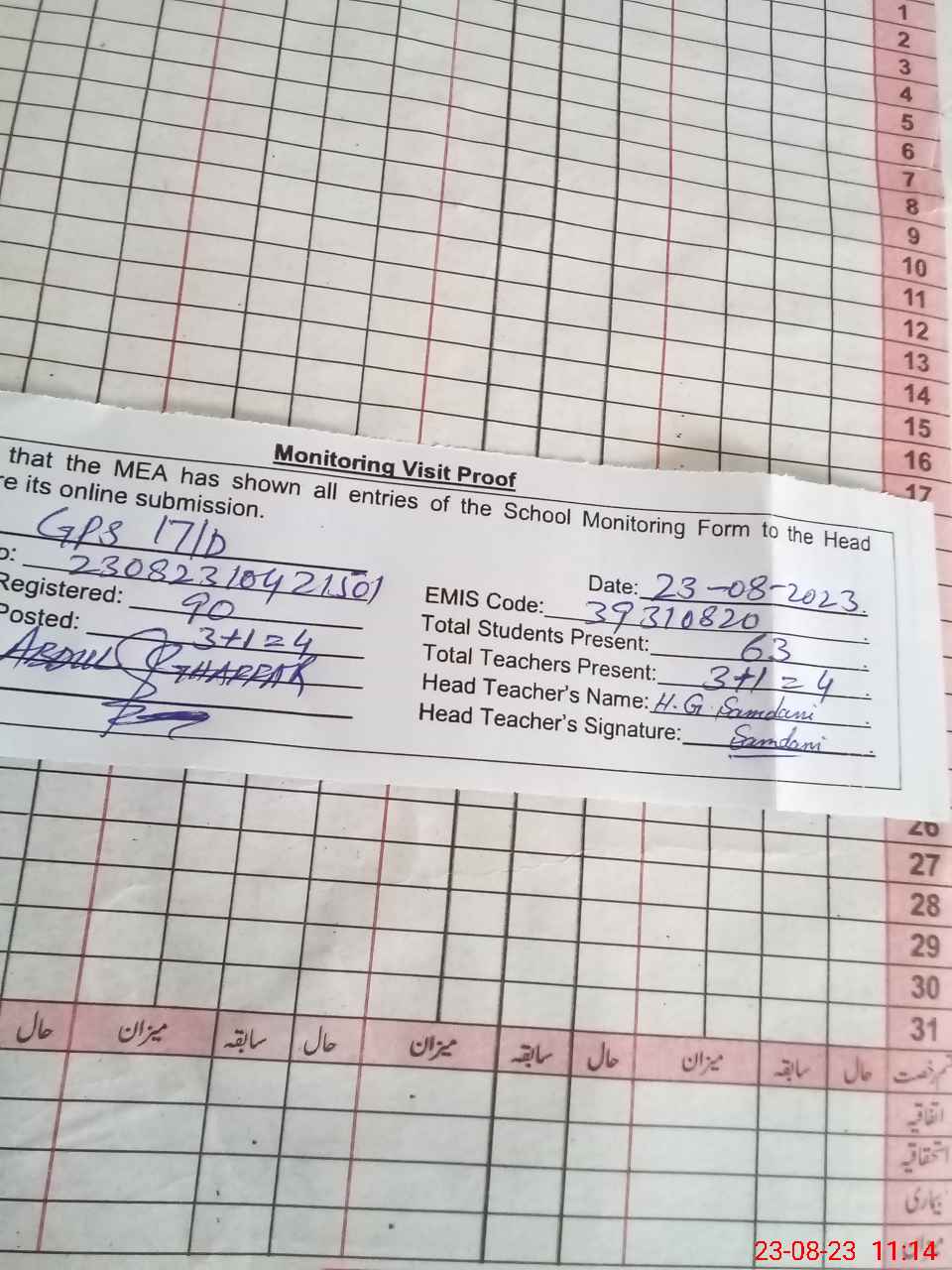 | Attendance Register | Head Teacher | MEA with School | Visit Proof |
