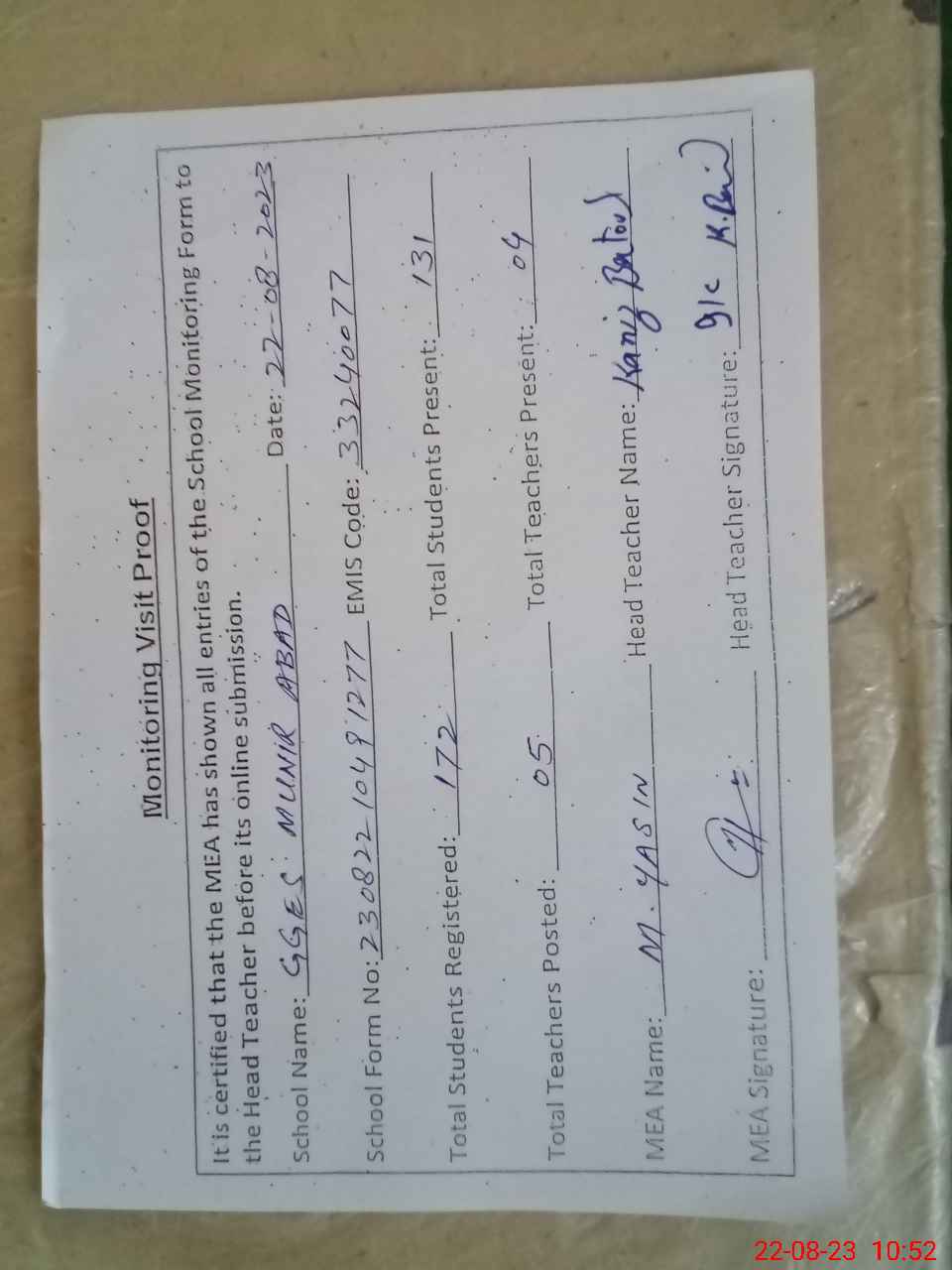 | Attendance Register | Head Teacher | MEA with School | Visit Proof |