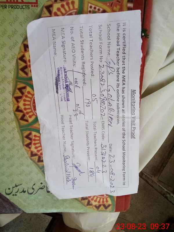 | Attendance Register | Head Teacher | MEA with School | Visit Proof |