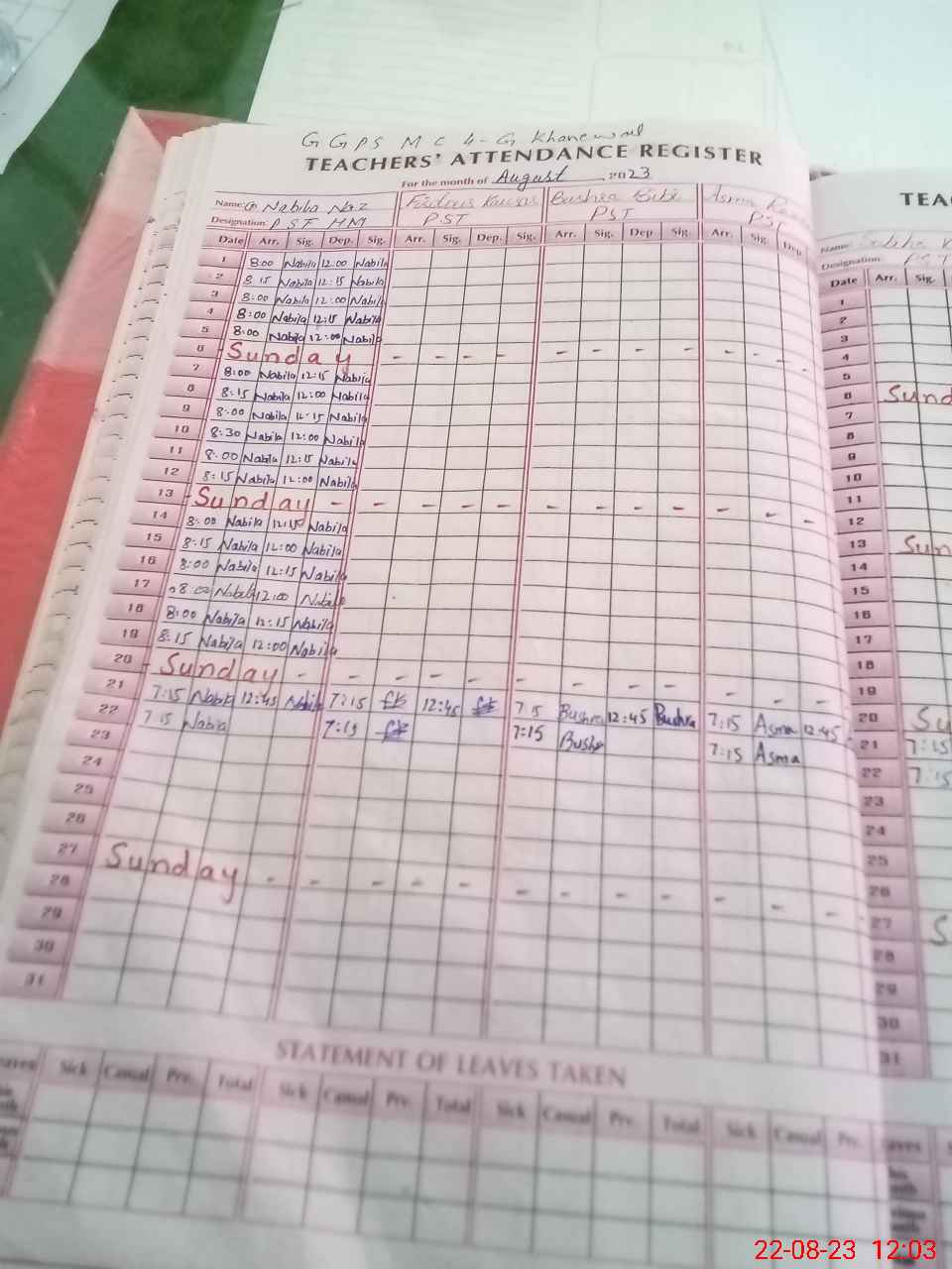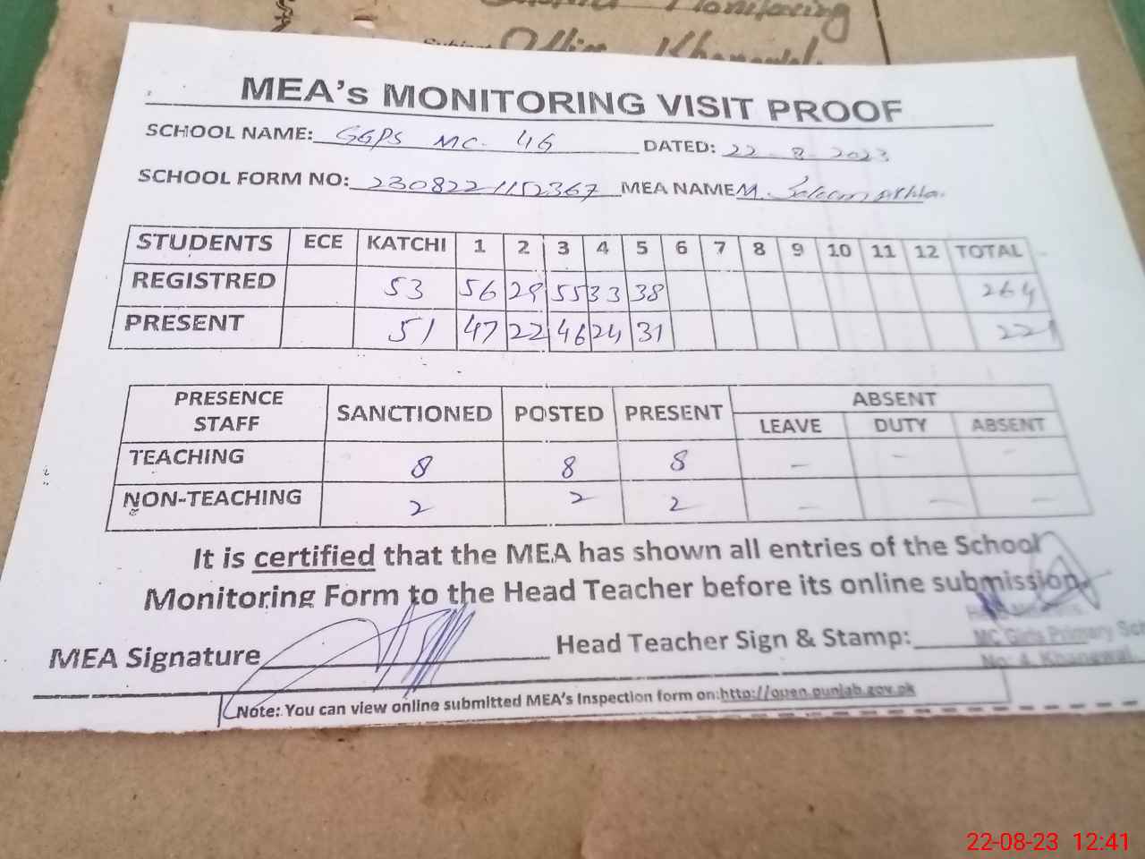 | Attendance Register | Head Teacher | MEA with School | Visit Proof |