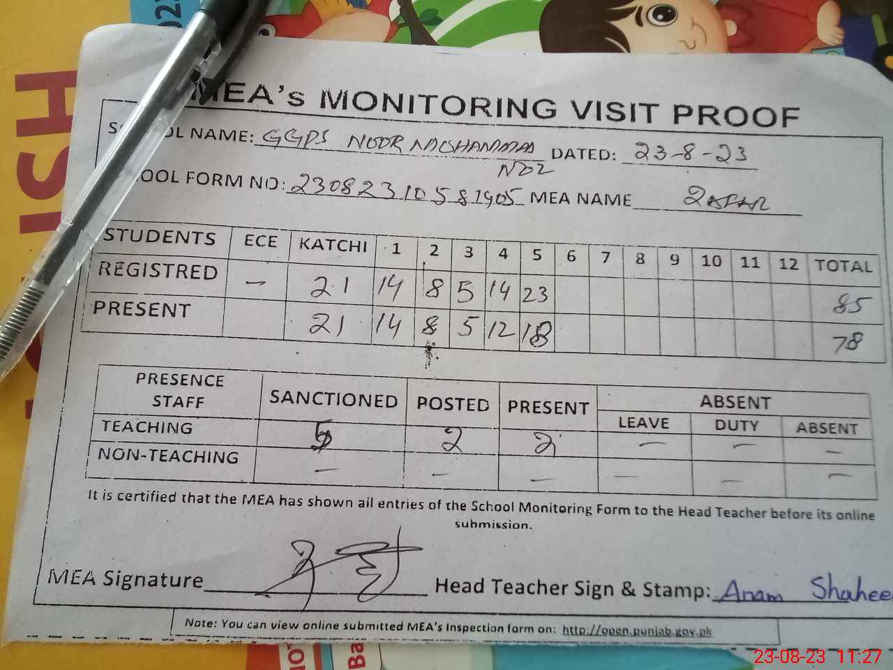 | Attendance Register | Head Teacher | MEA with School | Visit Proof |