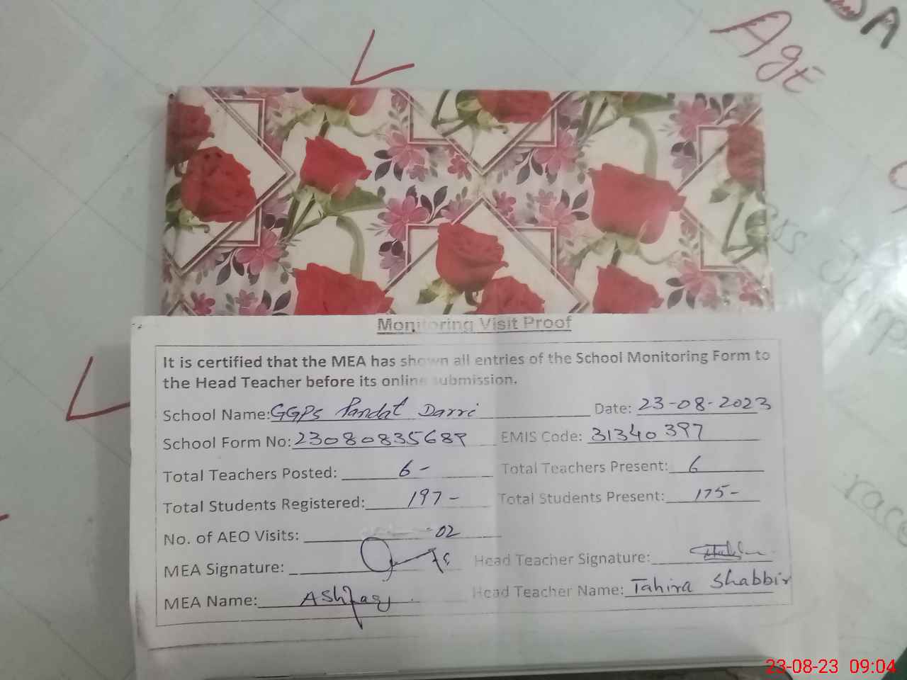 | Attendance Register | Head Teacher | MEA with School | Visit Proof |