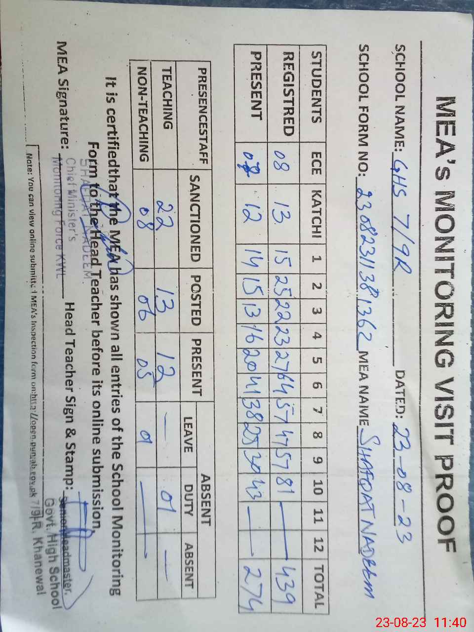 | Attendance Register | Head Teacher | MEA with School | Visit Proof |