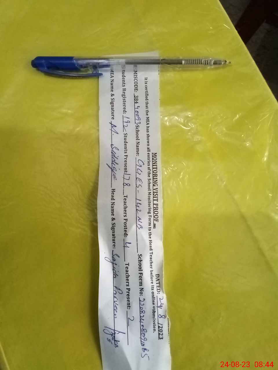 | Attendance Register | Head Teacher | MEA with School | Visit Proof |