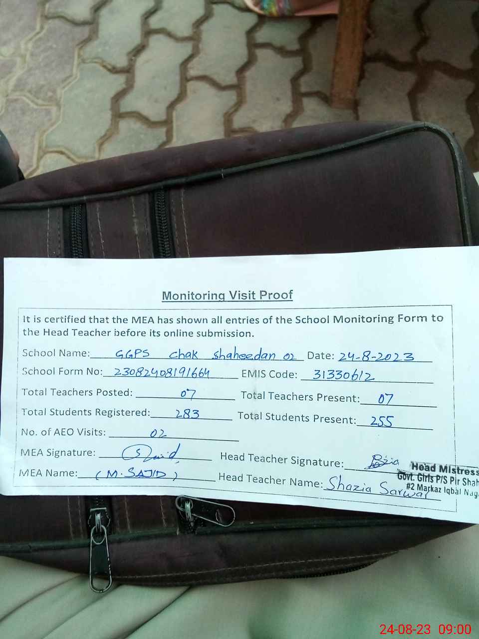 | Attendance Register | Head Teacher | MEA with School | Visit Proof |