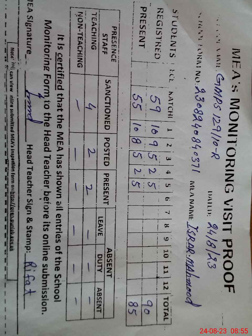 | Attendance Register | Head Teacher | MEA with School | Visit Proof |