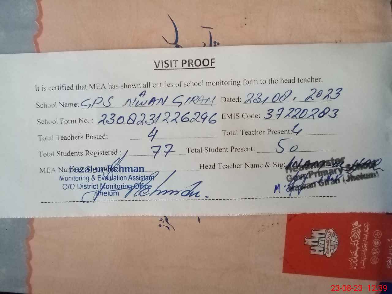 | Attendance Register | Head Teacher | MEA with School | Visit Proof |