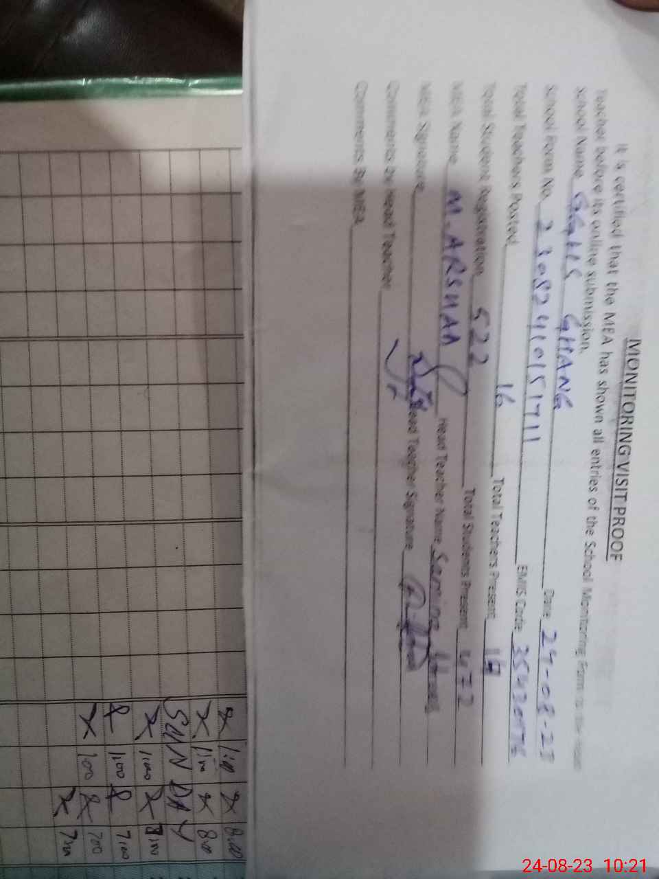 | Attendance Register | Head Teacher | MEA with School | Visit Proof |