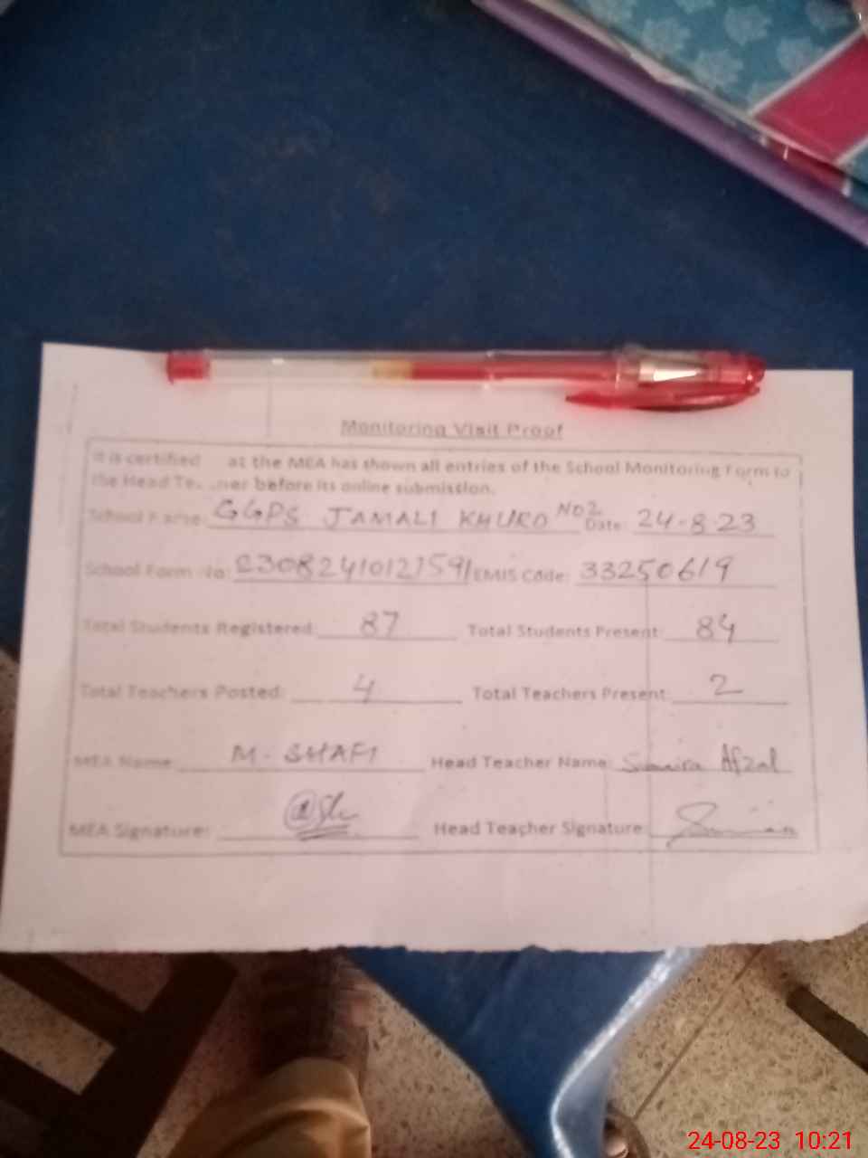 | Attendance Register | Head Teacher | MEA with School | Visit Proof |