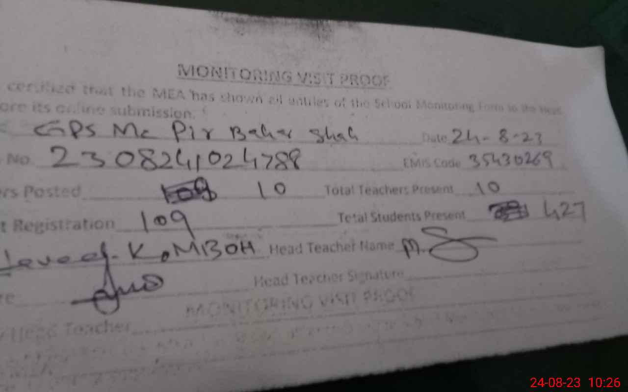 | EMIS Code: 35430269 | Name of School: GPS MC PIR BAHAR SHAH | |||