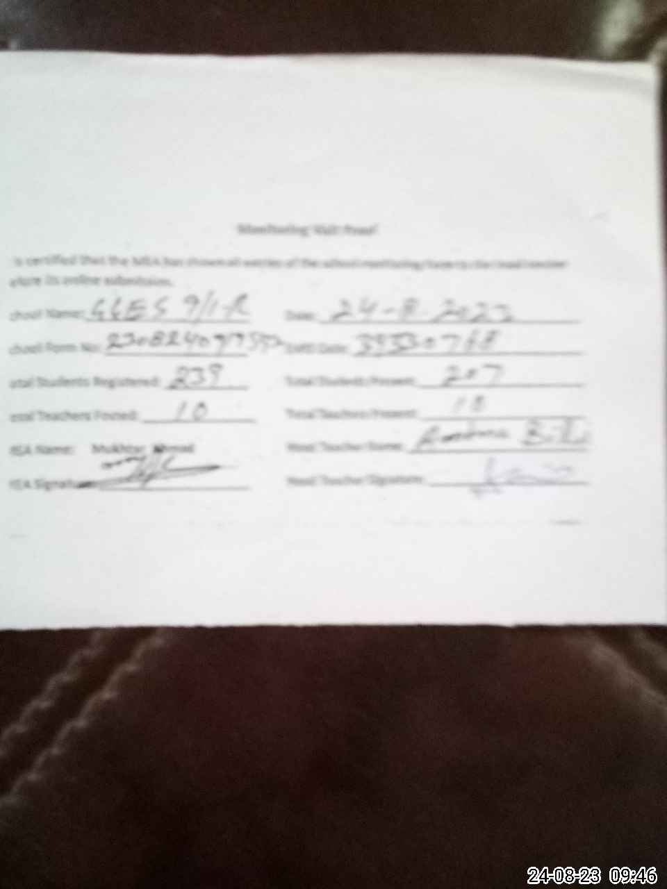 | Monitoring Date: 24-08-2023 | Start Time: 24-08-2023 09:19 AM | End Time: 24-08-2023 10:26 AM | Name of MEA: MU**** AH**** (R**** | |