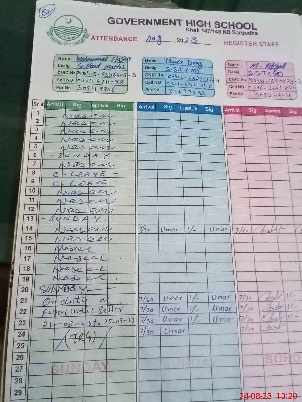 | CNIC | Full Name | Designation | R/C | Absence during last cal. month |