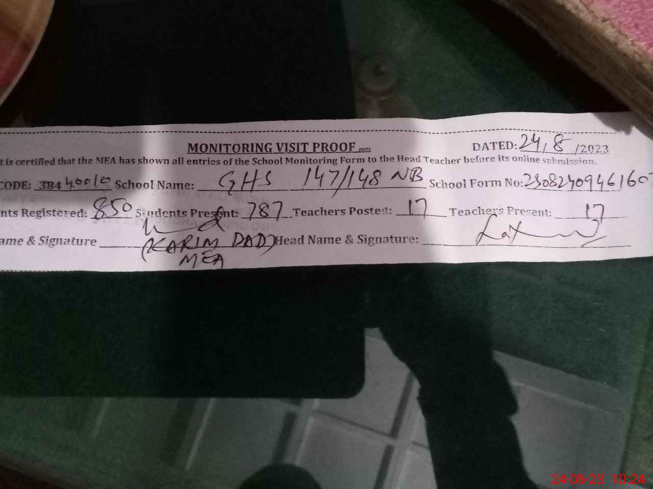 | Attendance Register | Head Teacher | MEA with School | Visit Proof |