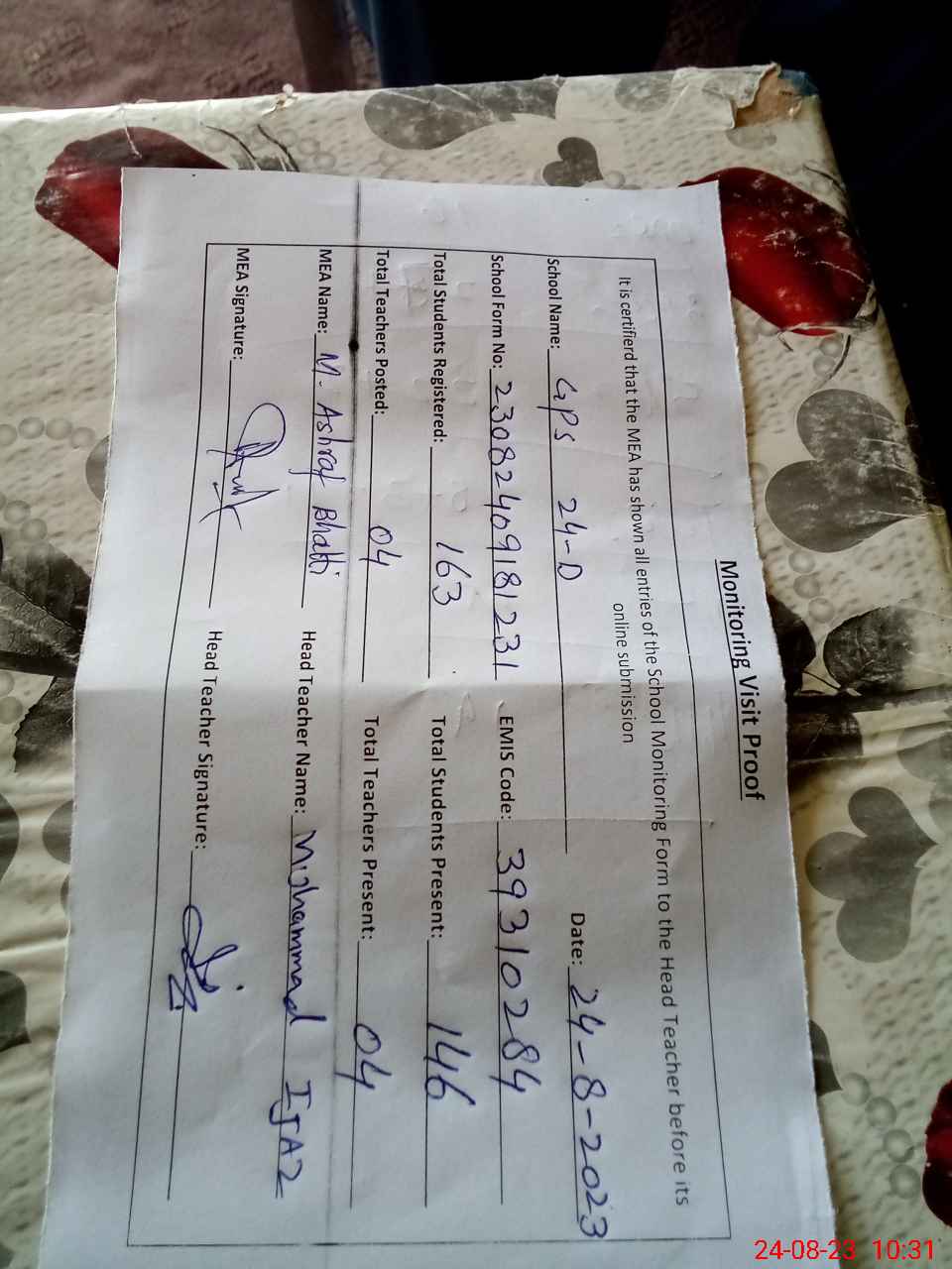 | Attendance Register | Head Teacher | MEA with School | Visit Proof |