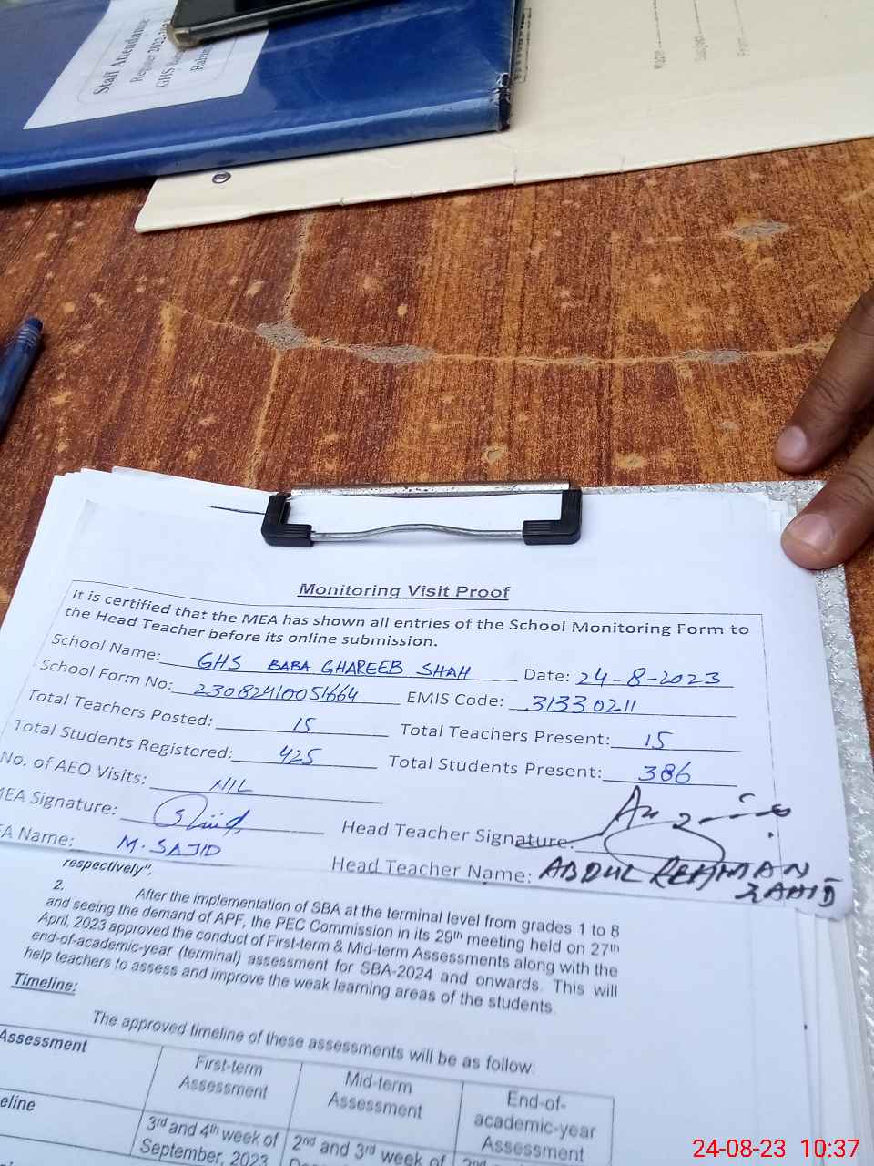 | Attendance Register | Head Teacher | MEA with School | Visit Proof |