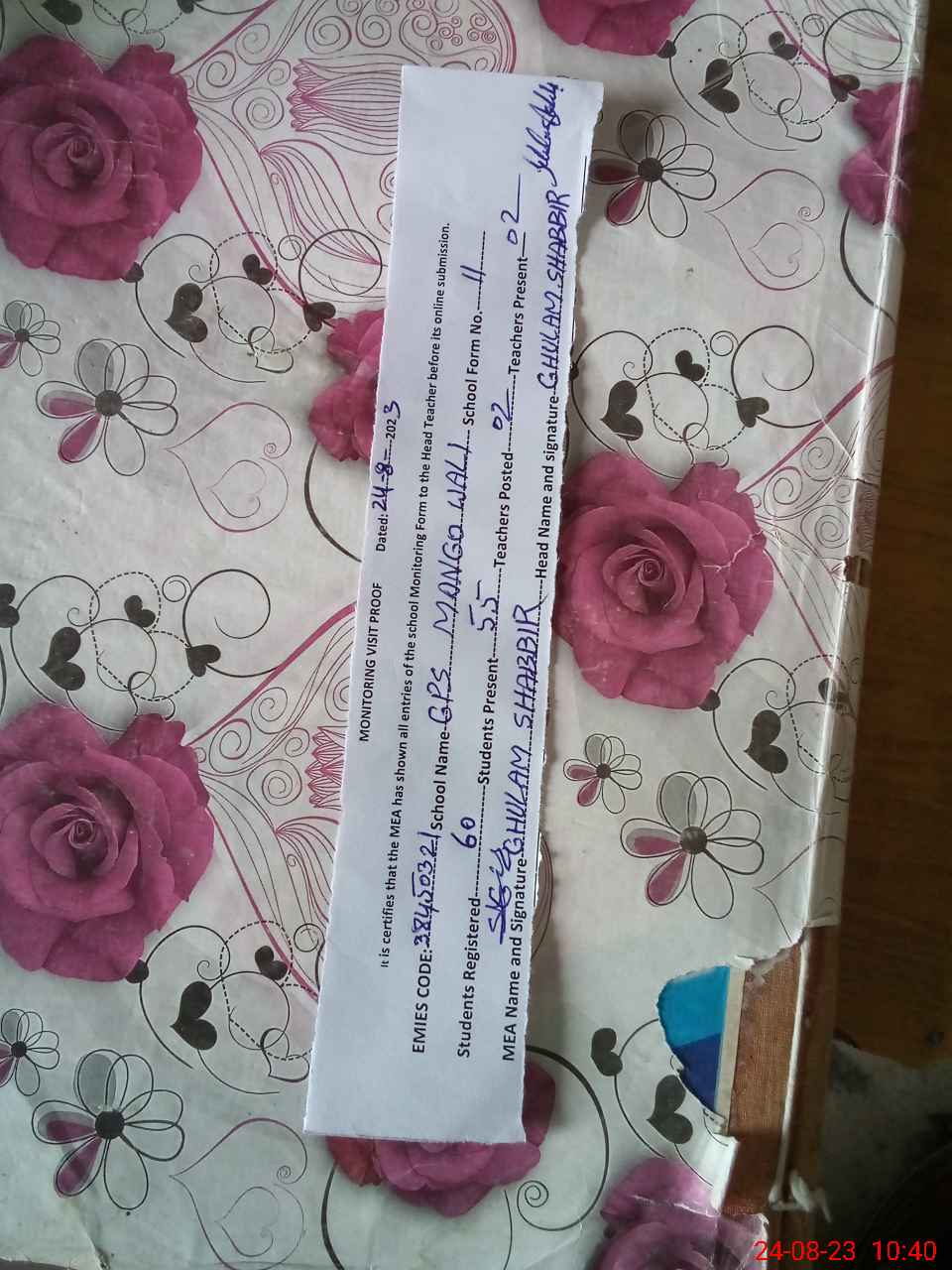 | Certified that this School was Inspected by the Undersigned MEA/DMO Today and the Information Stated Above is as Per Record. | |||||