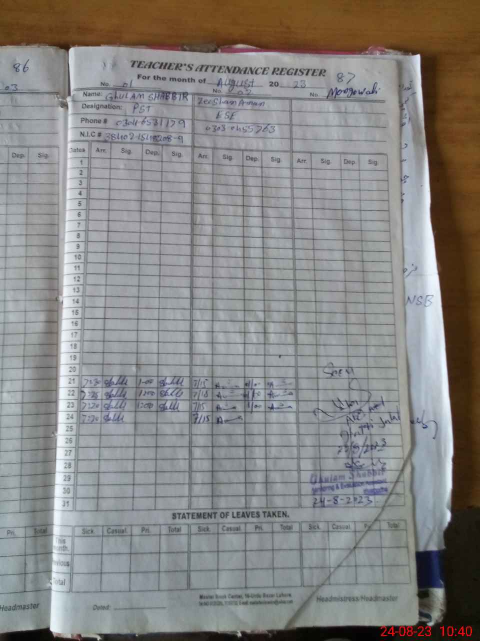 | Name: ZE**** AM**** Designation: (School Headmaster's/Headmistress's) ESE (SCI MATH ) Phone/Cell Number: 03**** |