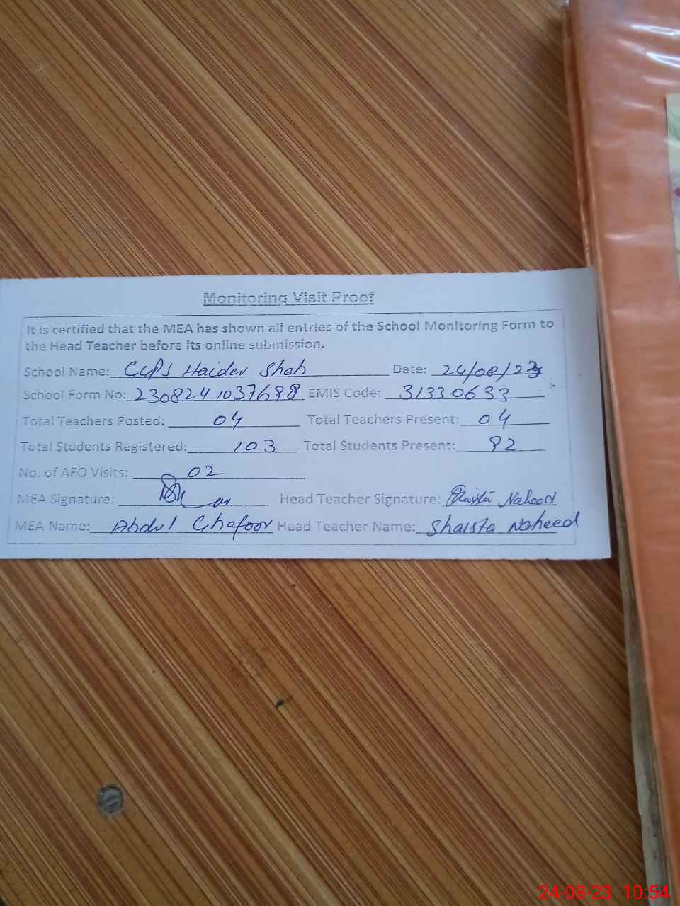 | Attendance Register | Head Teacher | MEA with School | Visit Proof |