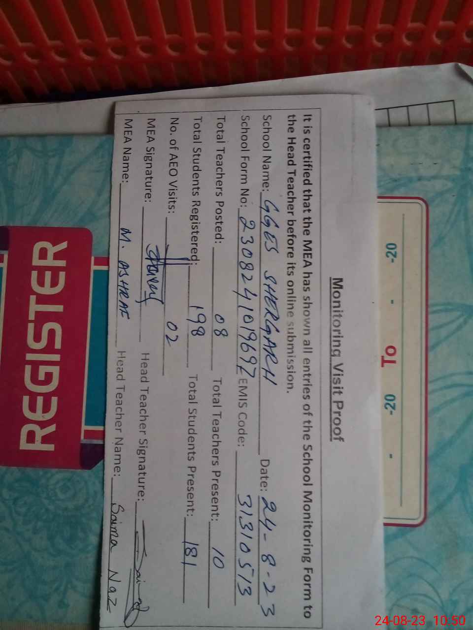 | Attendance Register | Head Teacher | MEA with School | Visit Proof |