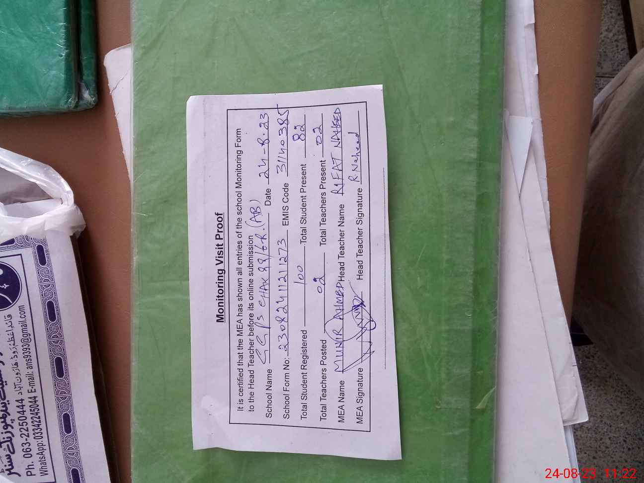 | Attendance Register | Head Teacher | MEA with School | Visit Proof |