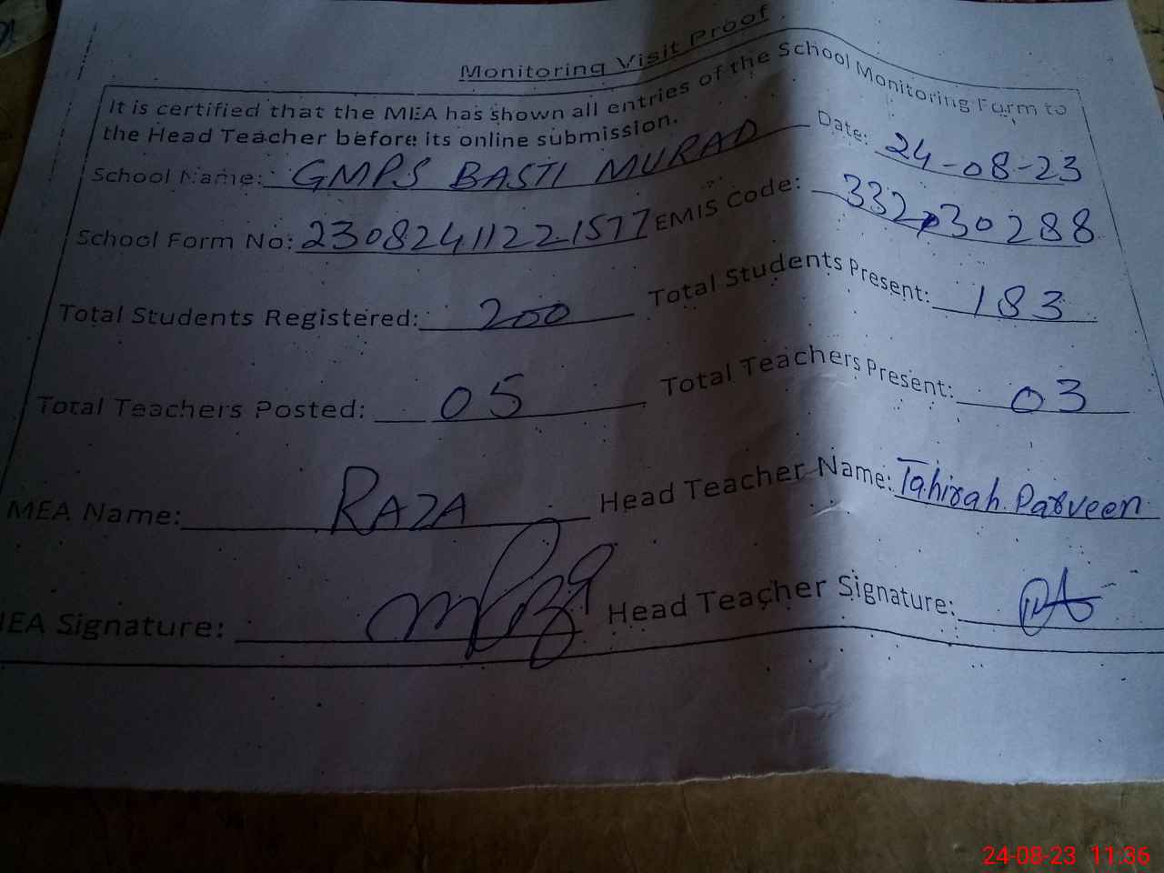 | EMIS Code: 33230288 | Name of School: GMPS BASTI MURAD | |||