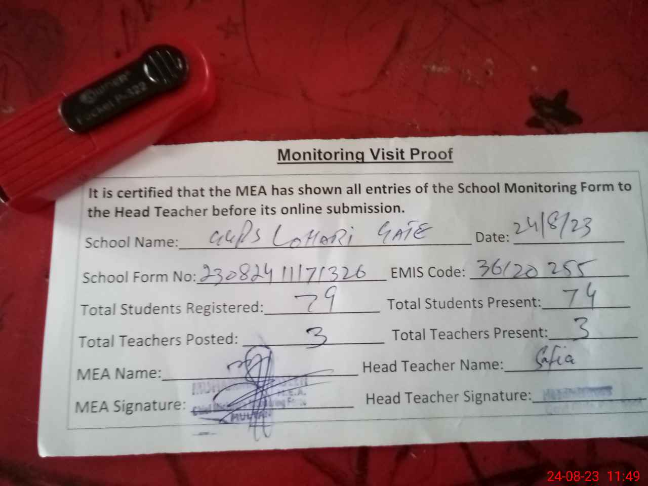 | Attendance Register | Head Teacher | MEA with School | Visit Proof |