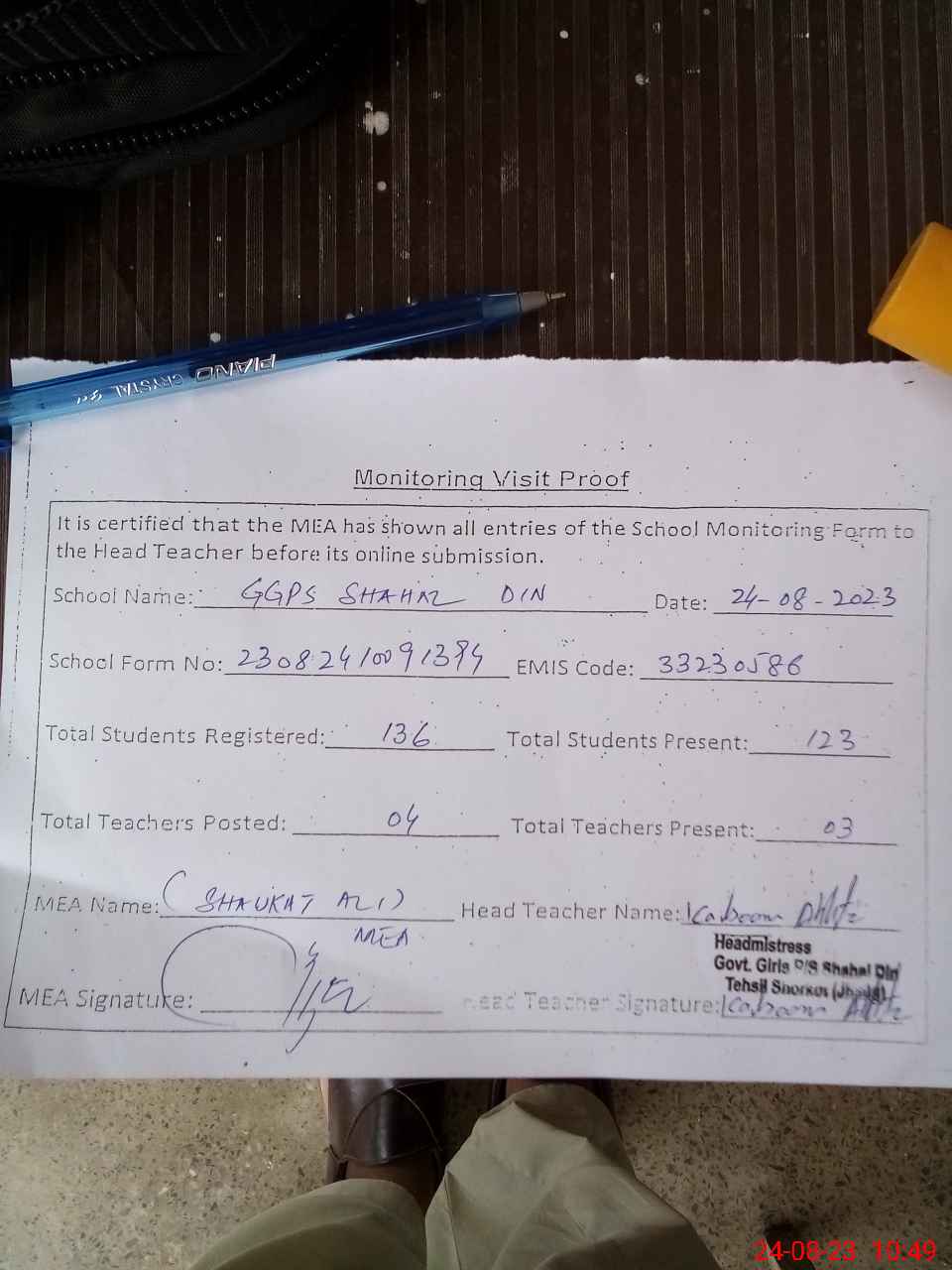 | Attendance Register | Head Teacher | MEA with School | Visit Proof |