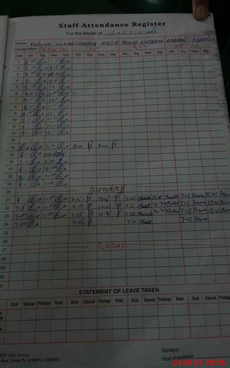 | Remarks (Use Separate Page if Required): Pst Hina manzoor posted to this school wef august 19 2023 and same not yet actioned on sis | |||||