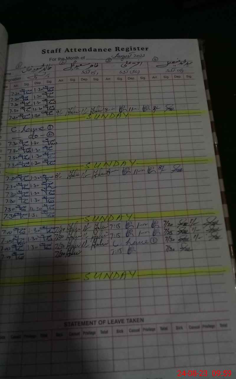 | CNIC | Full Name | Designation | R/C | Absence During Last Calender Month |