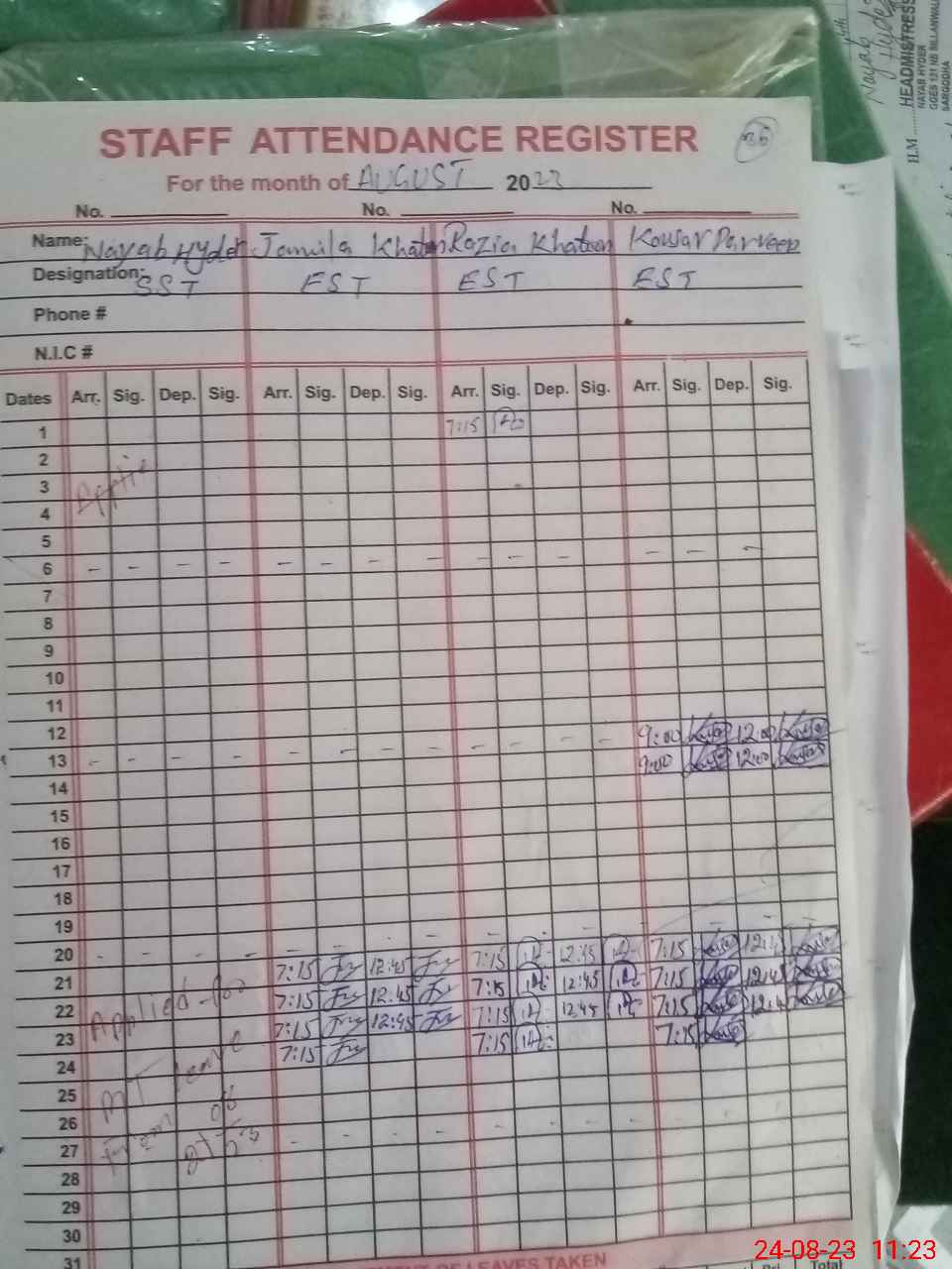 | CNIC | Full Name | Designation | R/C | Absence During Last Calender Month |