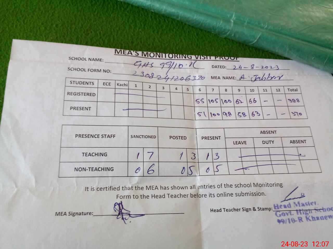 | Attendance Register | Head Teacher | MEA with School | Visit Proof |
