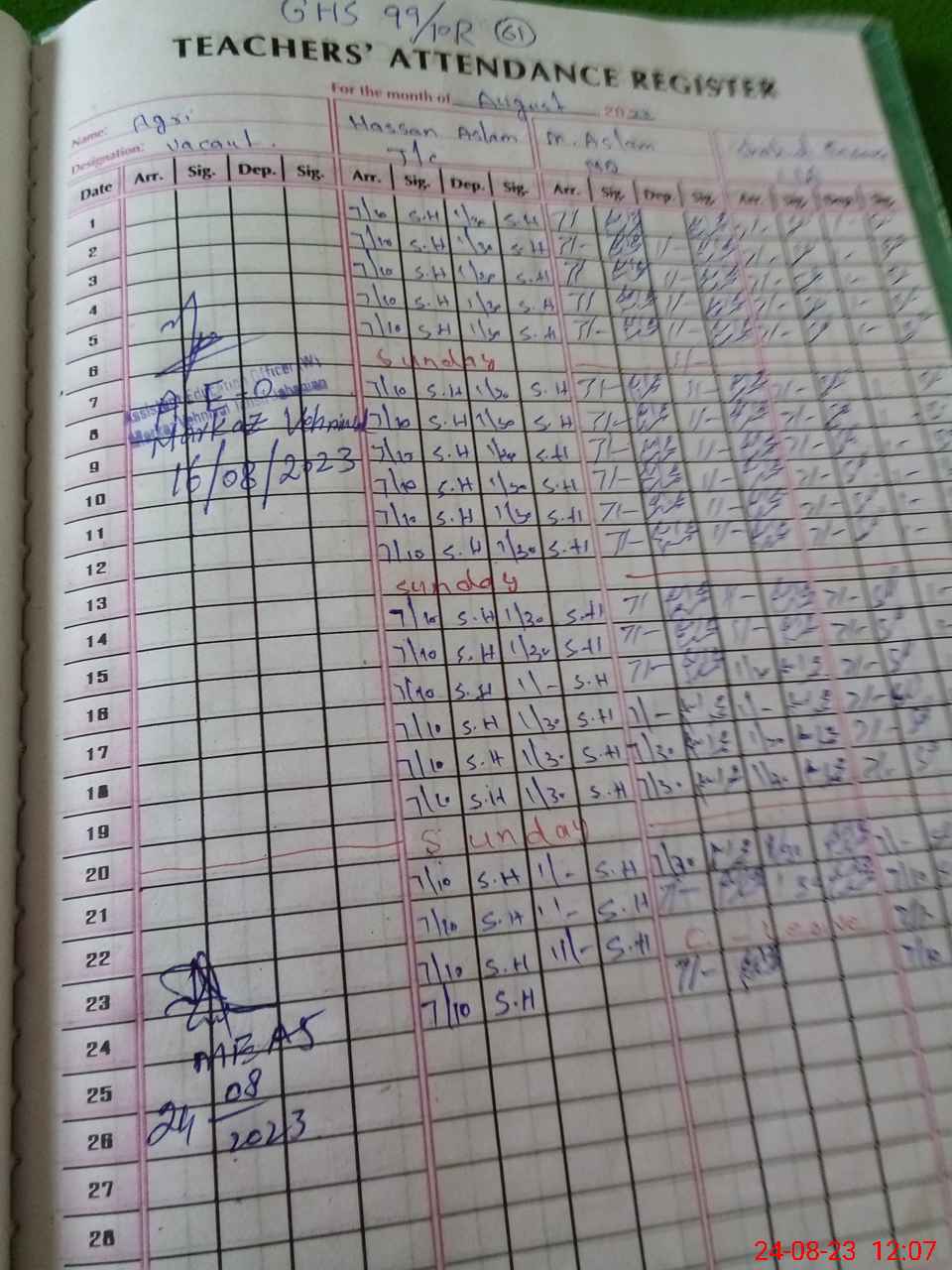 | CNIC | Full Name | Designation | R/C | Absence During Last Calender Month |