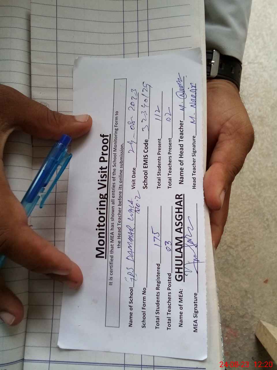 | Attendance Register | Head Teacher | MEA with School | Visit Proof |