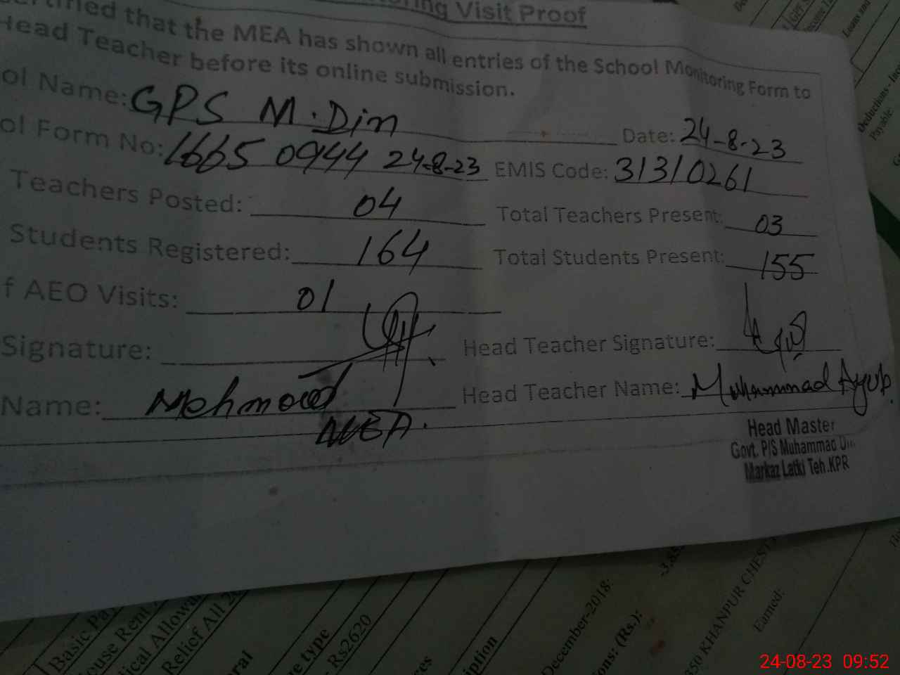 | Attendance Register | Head Teacher | MEA with School | Visit Proof |