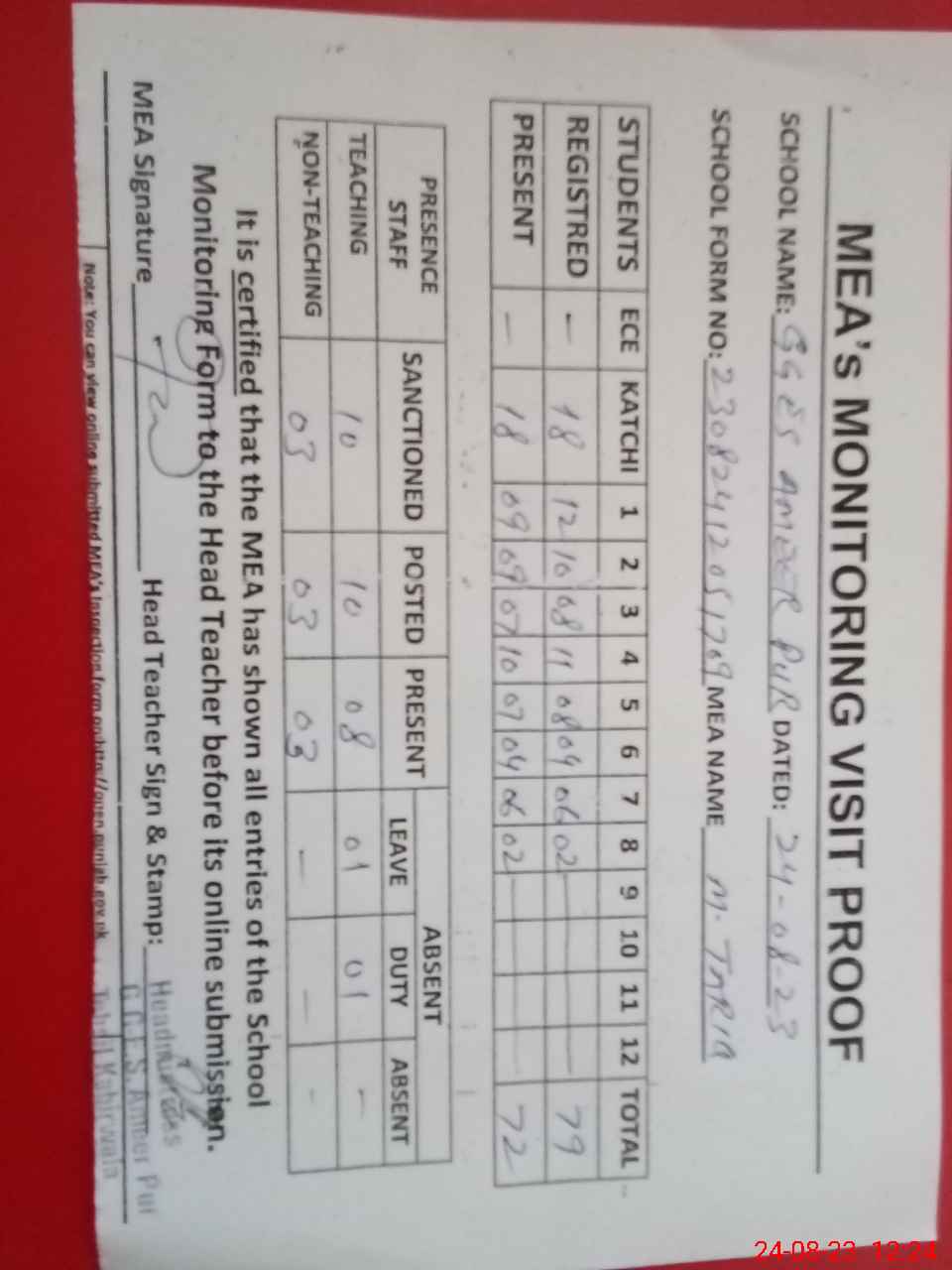 | Attendance Register | Head Teacher | MEA with School | Visit Proof |